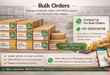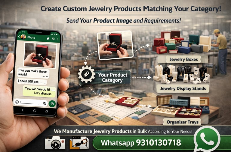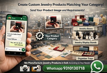 Send us your product image and requirements on WhatsApp, and we will manufacture jewelry boxes, display stands, and organizer trays tailored to your needs with the best quality and bulk pricing.